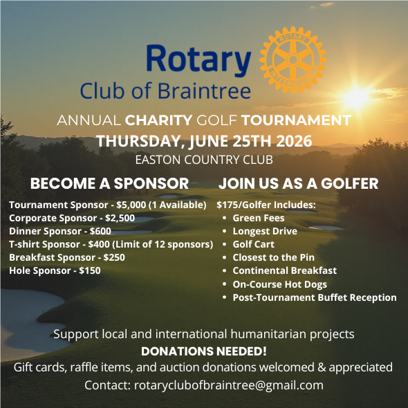 Annual Charity Golf TournamentA Day of Community, Connection, and ServiceThe Braintree Rotary Club is excited to host our Annual Charity Golf Tournament at Easton Country Club, bringing together golfers, sponsors, and community partners for a day of fun and impact. This long‑standing event is one of our most important fundraisers, helping us support local service projects, youth programs, scholarships, and community outreach throughout the year. Easton Country Club offers a beautiful and welcoming course, making it the perfect setting for a day that blends friendly competition with Rotary fellowship. Golfers will enjoy a scramble format, contests, raffles, and a post‑tournament reception.
